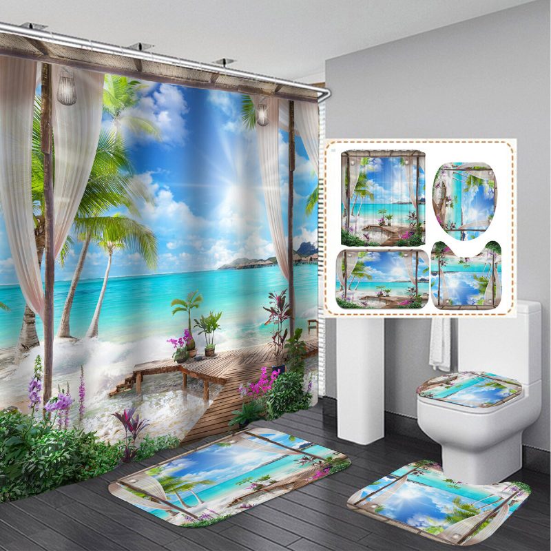 1/3 Db Zuhanyfüggöny Szett Bay Printing Wc Takarószőnyeg Fürdőszoba Csúszásmentes Szőnyeg
