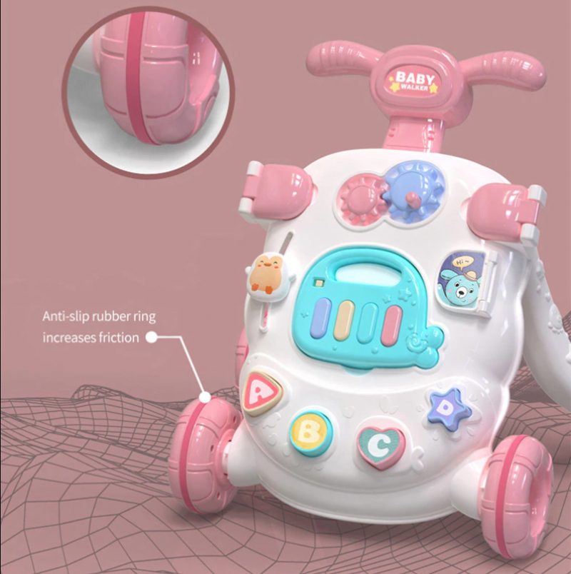 Az Ülő-Állva Tanuló Sétáló Csúszásmentes, Ütéselnyelő Puha Gumigyűrűvel Rendelkezik. Ami Növeli A Talajjal Való Súrlódást A Sebesség Szabályozásához. A Hátsó Kerék Fehér Alsó Része Forgatható, Úgy Van Beállítva, Hogy Megfeleljen A Babák Igényeinek A Járás Különböző Fázisaiban.