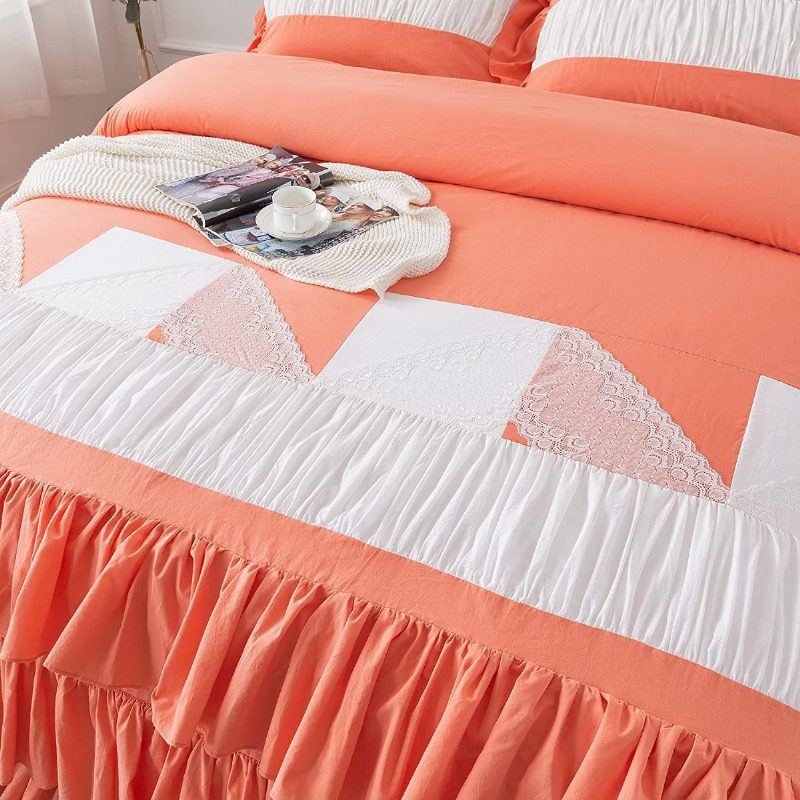 Lányos Hercegnő Ágyneműgarnitúra 3 Rétegű Korall Narancssárga Fodros Fehér Csipkével És Redőzött Mintás Paplanhuzattal